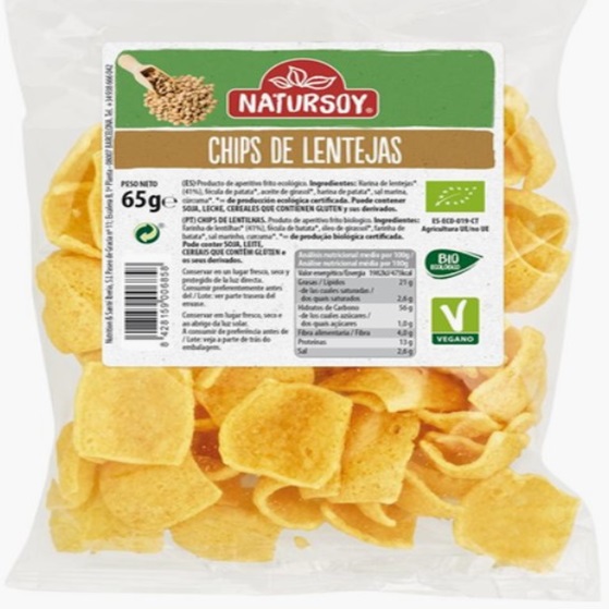 Ingredientes: Harina de lenteja*(37%), fécula de patata*, aceite de girasol*, harina de patata*, sal marina, cúrcuma*. Puede contener LECHE y sus derivados. *De producción ecológica certificada.